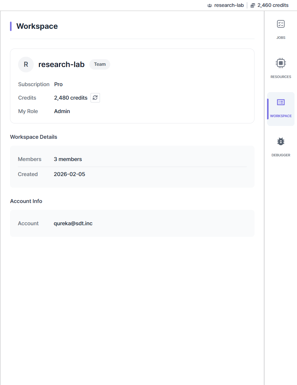 Workspace (Workspace Information): Check current workspace details and your real-time credit balance.