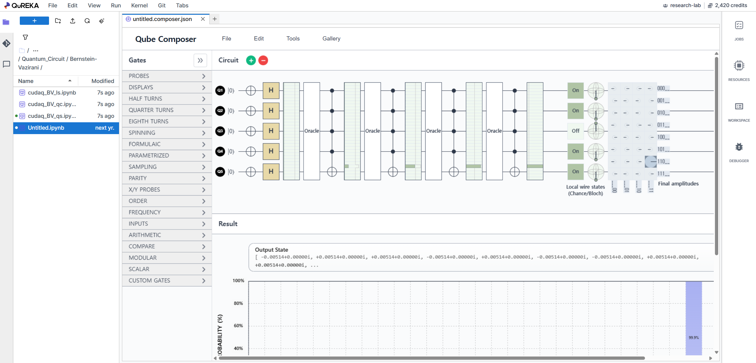 Real-time Simulation: Instantly updates output states and histograms for up to 16 qubits using GPU acceleration upon any design modification.
