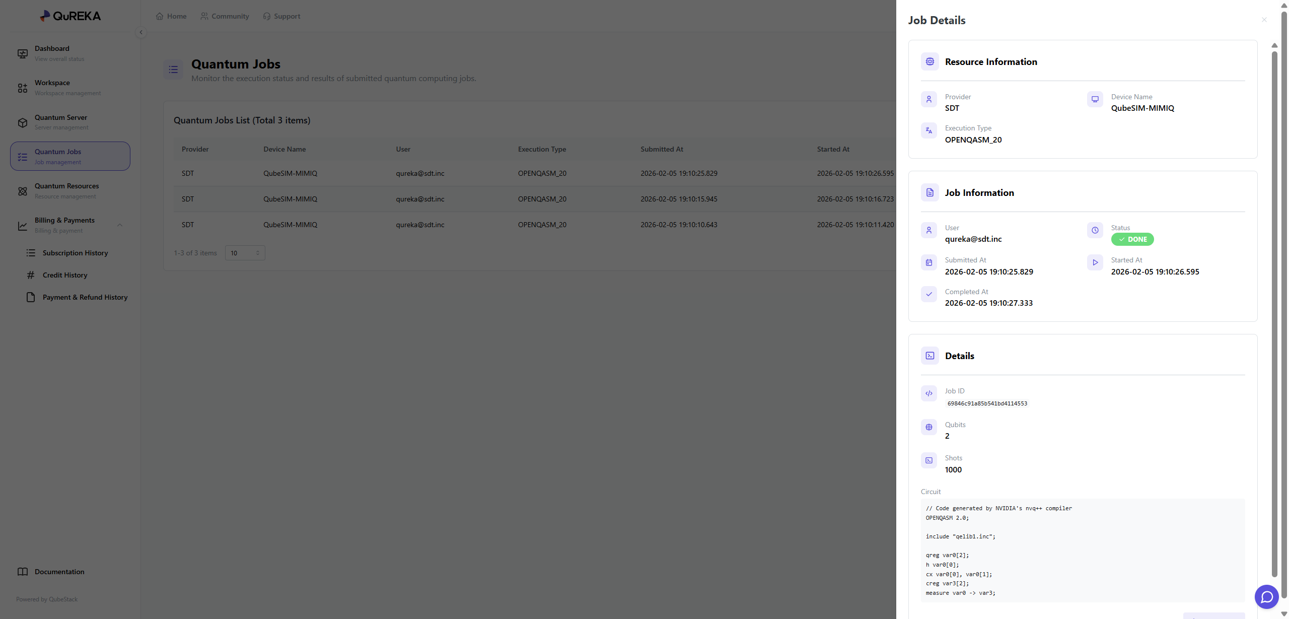 The Quantum Jobs page is where you can monitor the quantum jobs executed within your workspace. It allows you to track the progress of all submitted tasks and conduct a detailed analysis of the results for completed jobs.