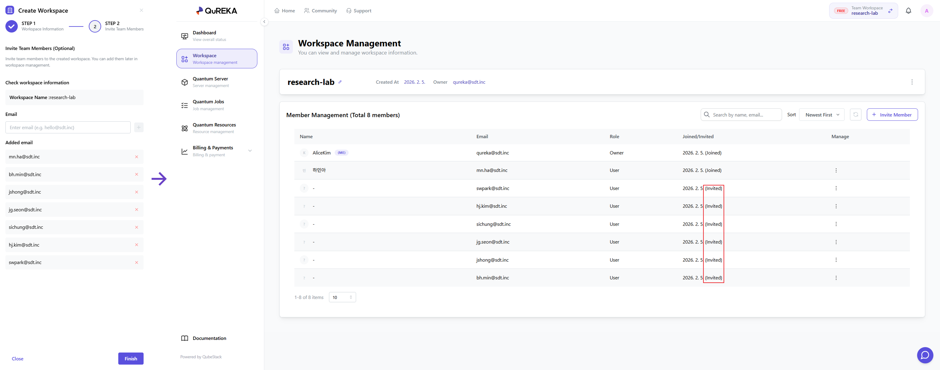 QuREKA provides a management environment based on Workspaces for efficient collaboration. In addition to personal workspaces, users can create team workspaces for collaborative development and invite colleagues.